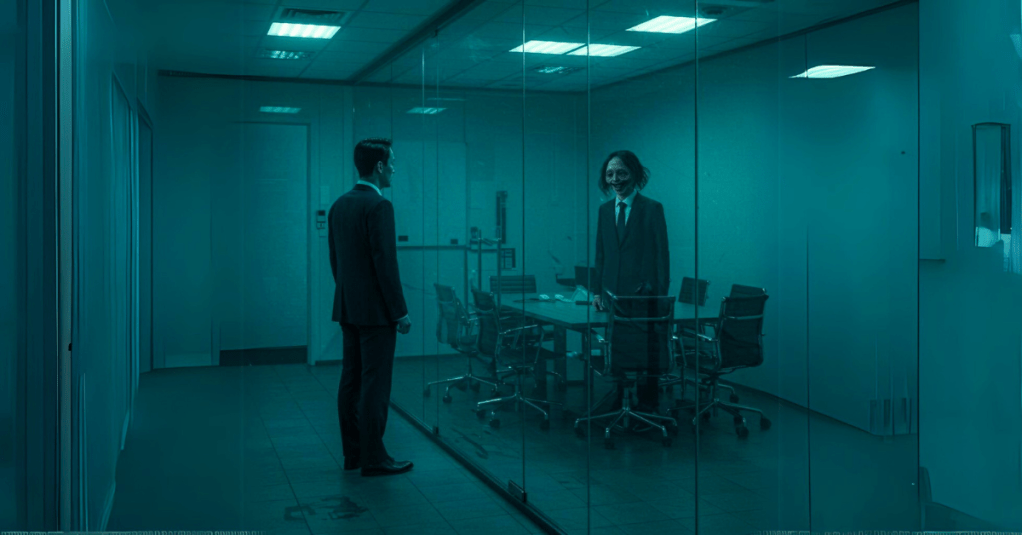 我潛入很多會議室,都找不到阿聰。不過在一處昏暗的會議室外面,竟然看到一個跟著我移動的身影,嚇得我差點暈倒。